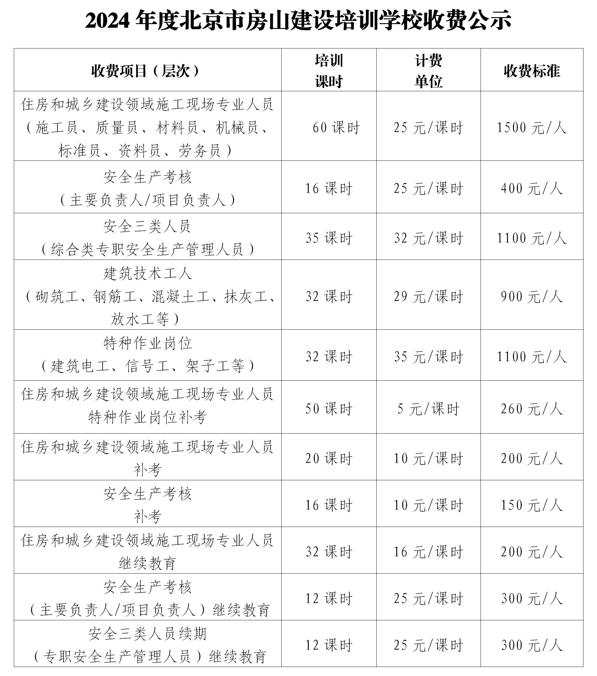 2024年度北京市房山建设培训学校收费公示